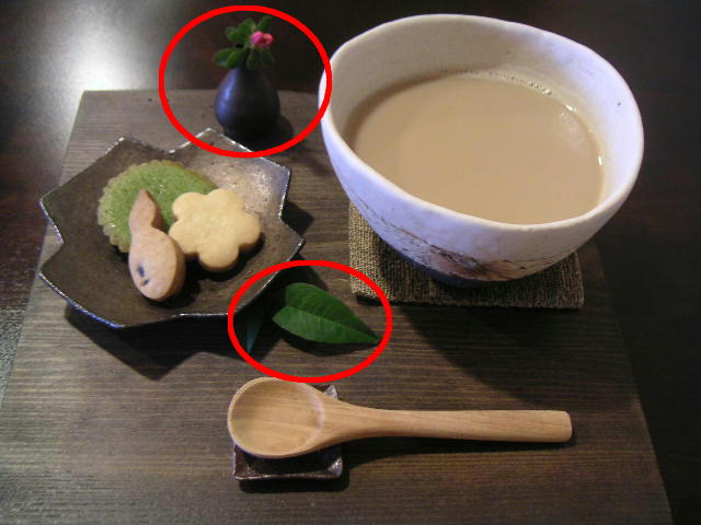 一輪挿しの花と葉っぱがセットで供されている(自分が注文したものにまず目がいって、次に「食べられるもの=クッキー」に目がいって、それでおしまいっていう人が多いと思うのだけれど、お盆とともに供されてきたものも「愛でる」ゆとりがほしいものです。