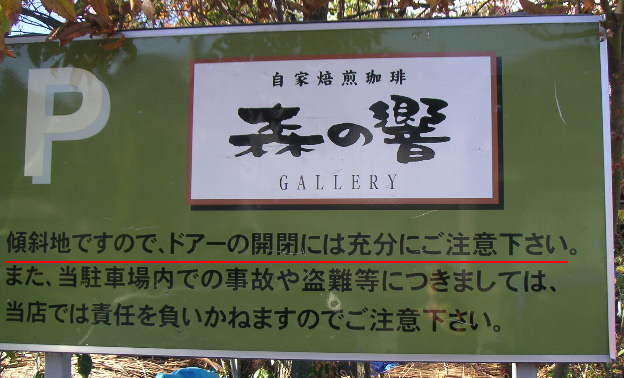 駐車場の案内板にも特にドアの開閉についての注意書きが記されています(傾斜地で下方にドアを開くと、勢いよく隣のドアにぶつけてしまうのですね)。